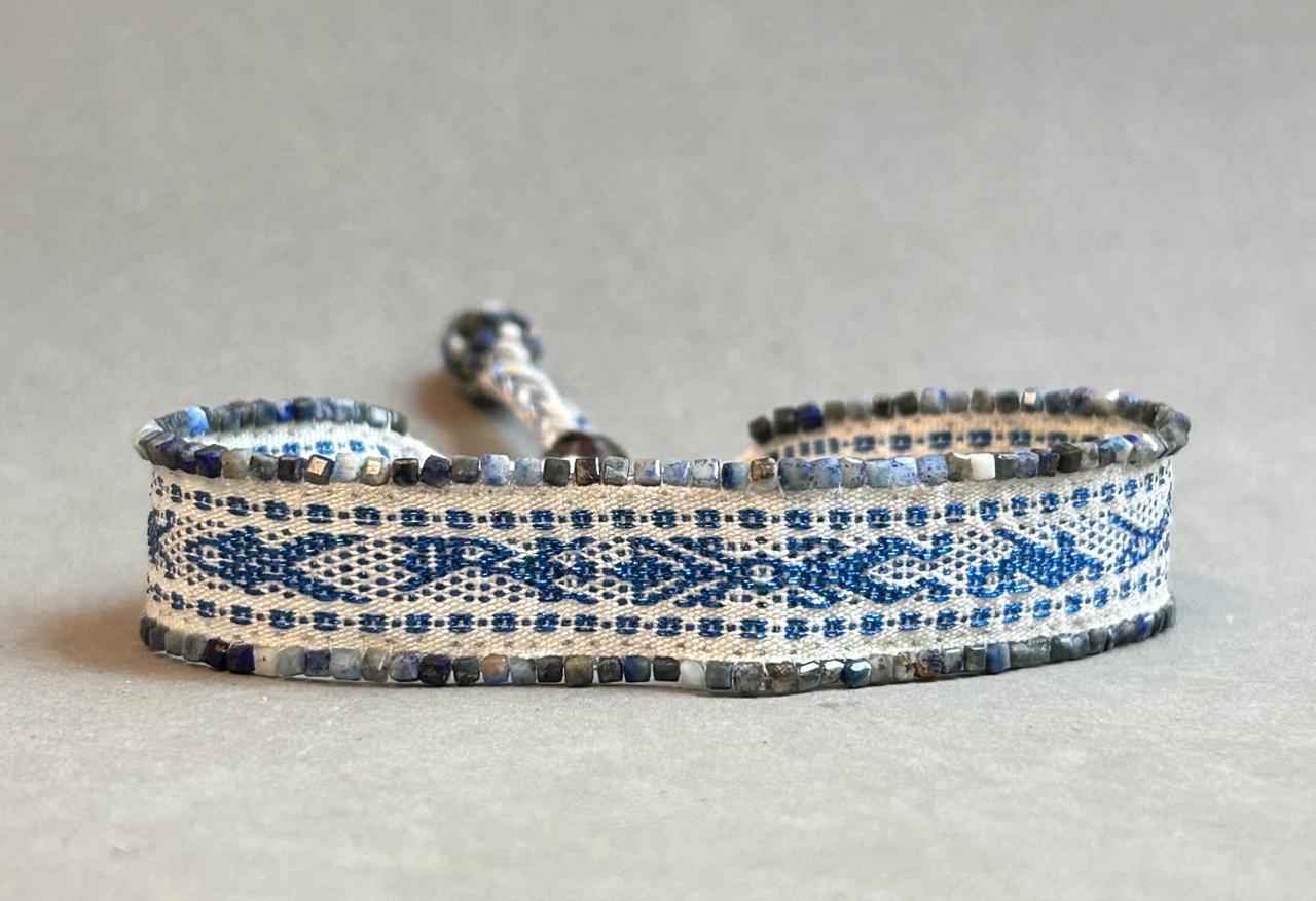 Loom bracelet, woven with a bit of metallic thread, the stones that surround it are lapis lazuli, it closes with a leather adjuster that fits the hand.