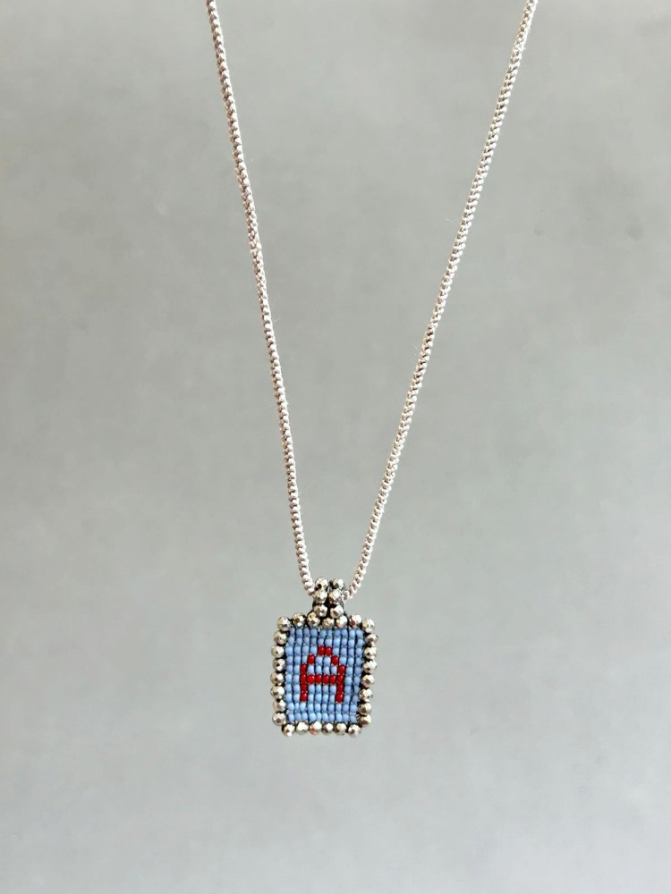 Murano square with the letter "A" or with the letter "M" around it has faceted pyrites and is on a gray silk necklace.