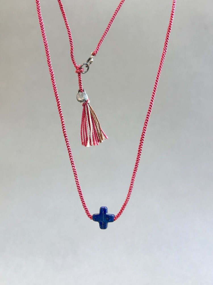 Necklace woven in red silk, with a cross of lapis lazuli in the center, fastens with a parakeet and a 925 silver jump ring.