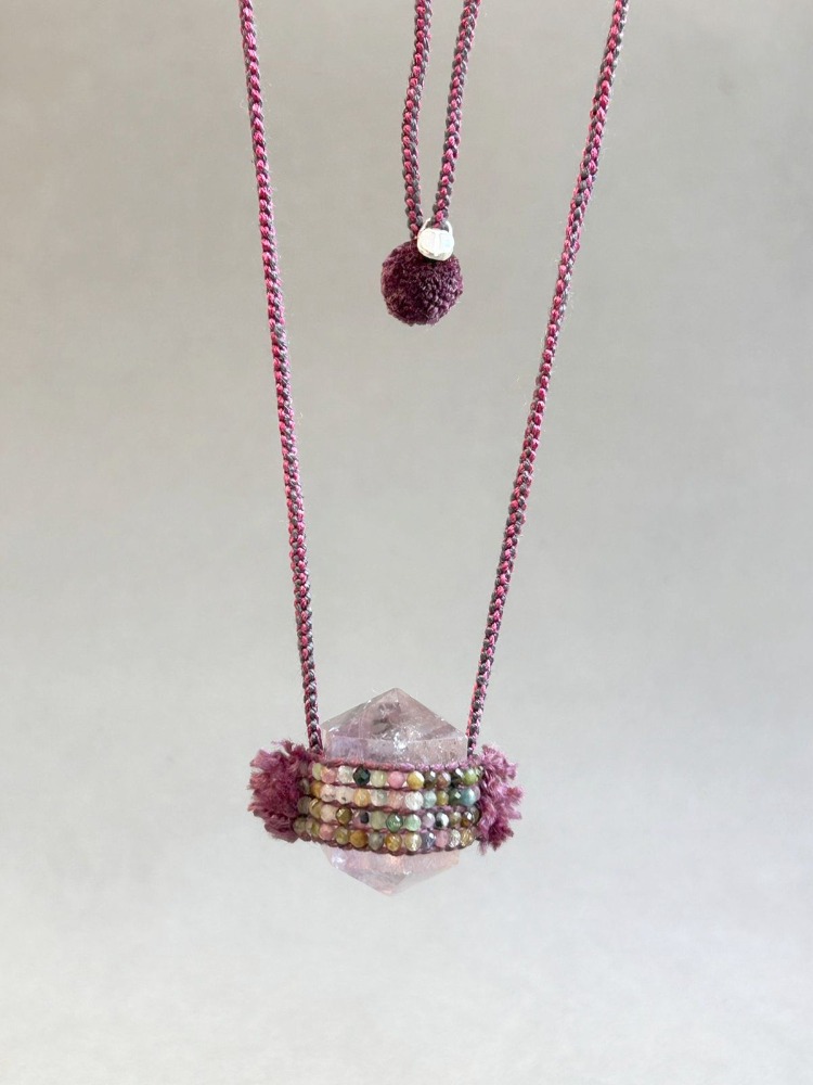 Long necklace woven in pink and gray silk, with an amethyst quartz surrounded by tourmalines and a cute pompon.