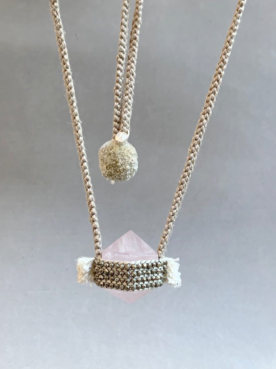 PINK QUARTZ AND PYRITE NECKLACE AROUND, NECKLACE WOVEN IN SILK