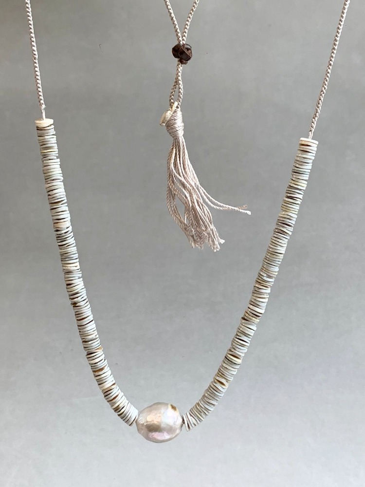 silk necklace handwoven by Mexican artisans, with shell flakes and a freshwater pearl in the center,