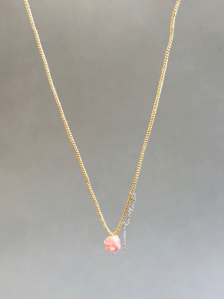 Necklace woven in golden silk, with a coral rose. Nearby it has a 925 silver chain.