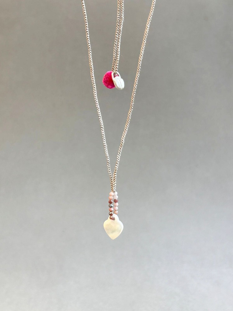 Necklace woven in gray silk, with a mother-of-pearl heart and a cute pink pompom, attached with a small rhodochrosite hoop.