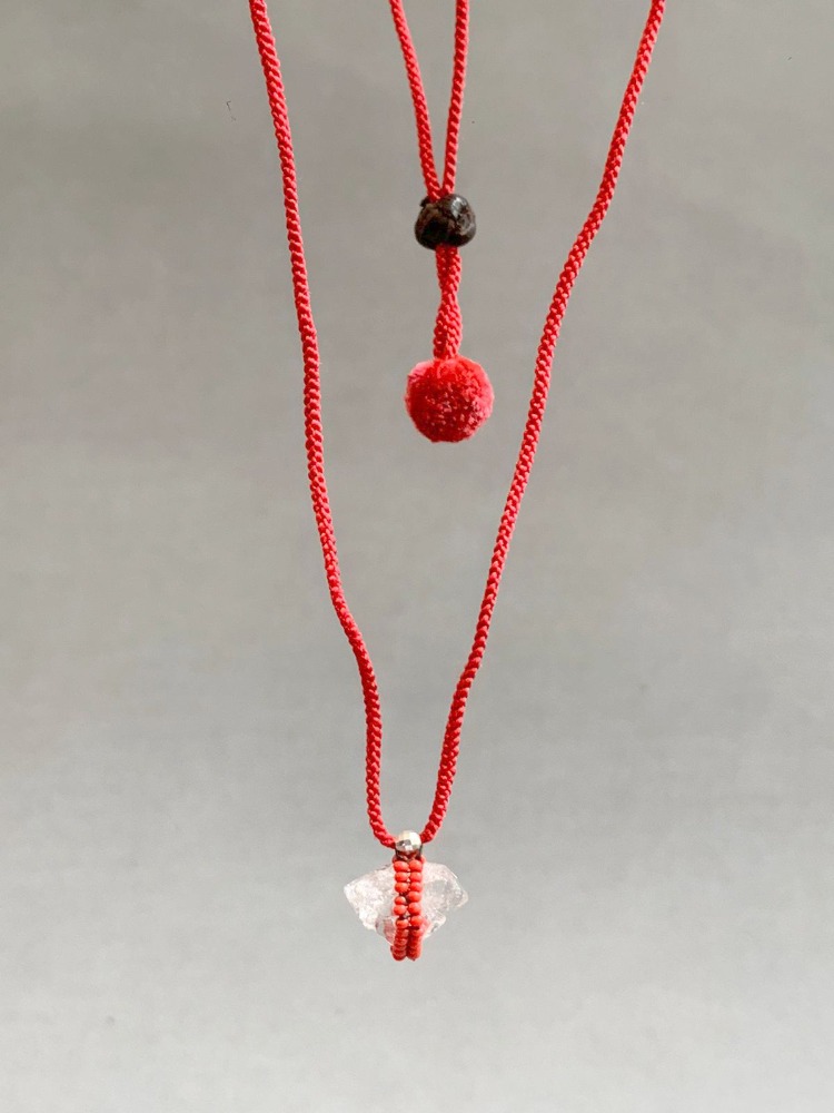 Hand-woven silk thread necklace with a Herkimer diamond wrapped in Murano crystals of various colors. Finished with a silk pompom and a hand-woven leather adjuster.