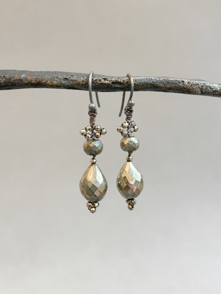 Earrings woven in silk with pyrite, the hooks are 925 sterling silver