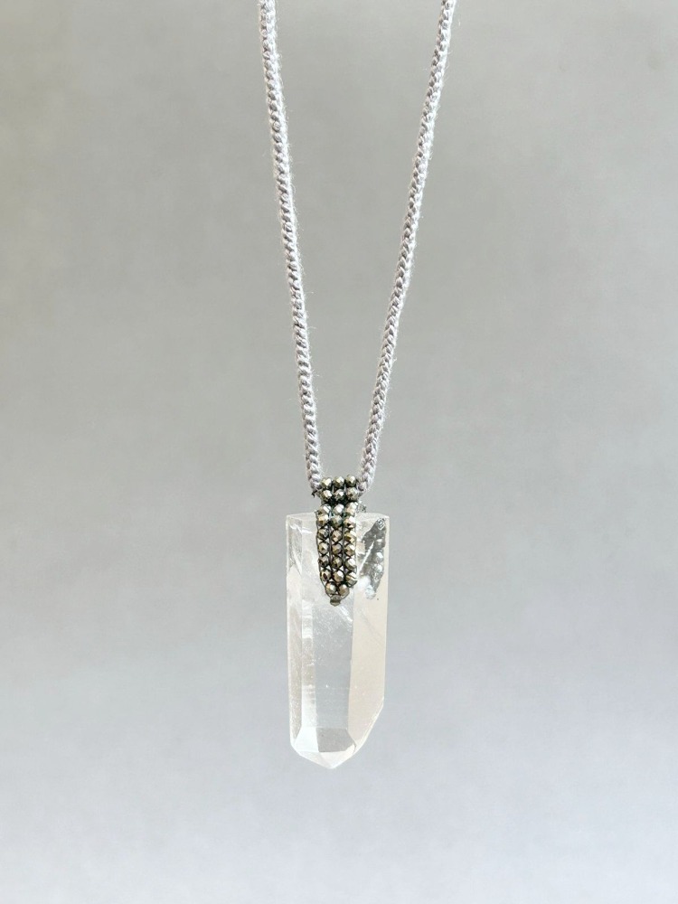Gray silk necklace hand-braided with a white quartz with hematites or pyrites. It has a leather adjuster and ends in a ball-shaped silk pom pon.