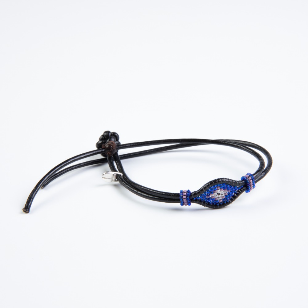 Black Greek leather bracelet with a braided knot on the edge and in the middle an eye made of royal blue, white, pink, and black Murano glass crystals with two handles made of royal blue and pink Murano glass, one on each side.