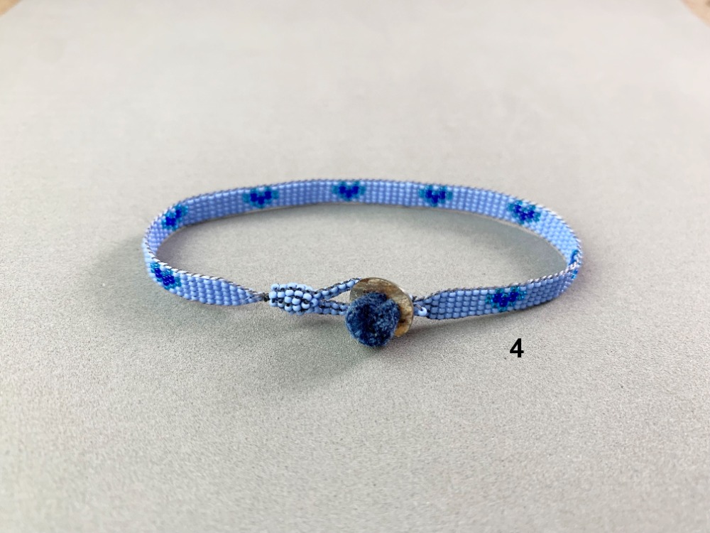 Woven entirely with 1mm murano, closes with a mother of pearl button and a small colored pom-pom.