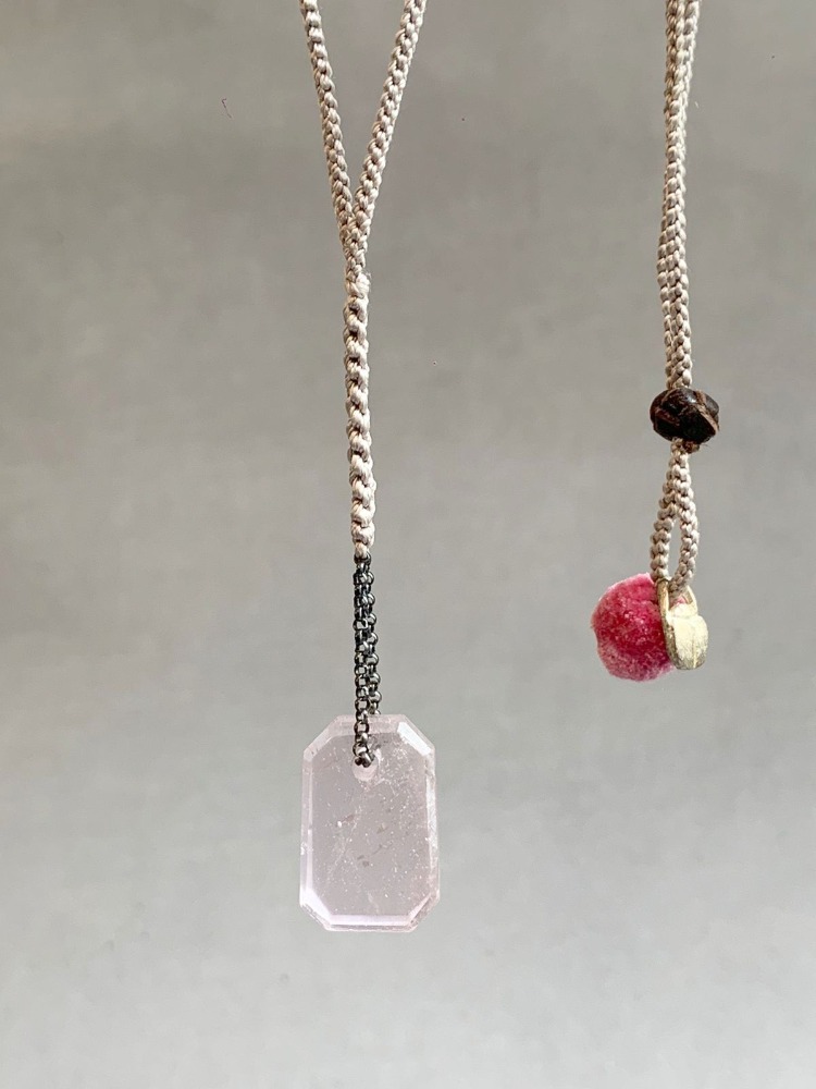 Hand-woven silk necklace with a small 925 silver peacock chain with a Kunzite stone. It has a hand-woven leather adjuster and ends with a silk pompom also handmade.