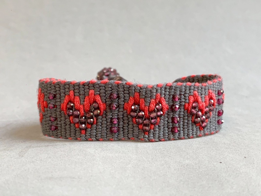Embroidered loom bracelet with garnets, heart-shaped beads, a leather adjuster, and finished with a garnet bead