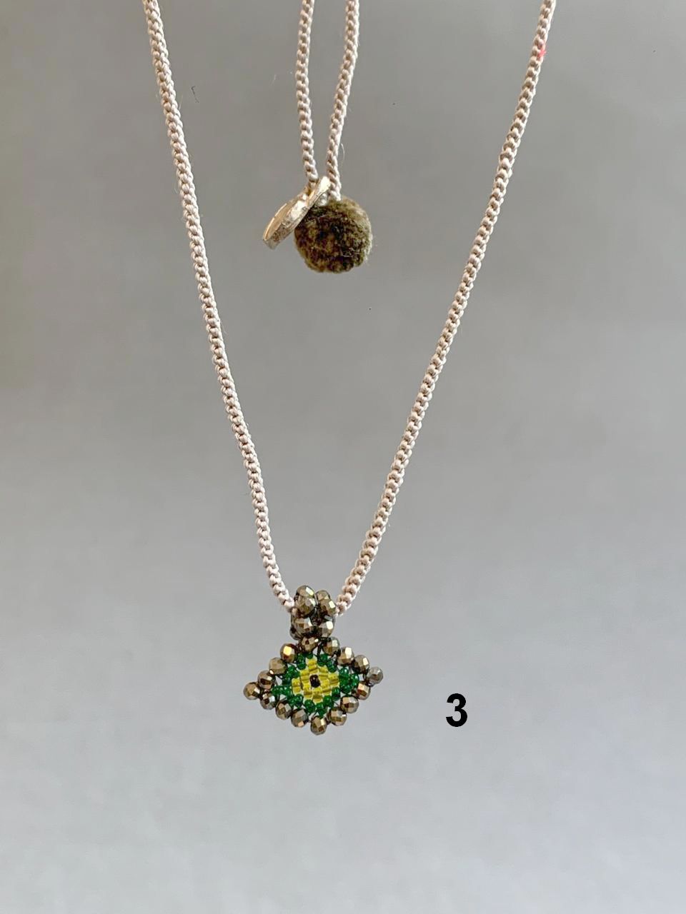 Hand-woven silk necklace with a little eye charm made of Murano crystals, finished with a handmade silk pompom and a leather-woven adjuster.