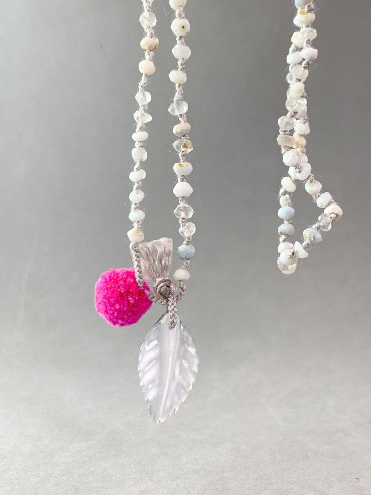 Hand braided silk collar with mother of pearls ending with a red silk pompom in the shape of a ball. It hangs a mother of pearl leaf with a mini silk pompom.
