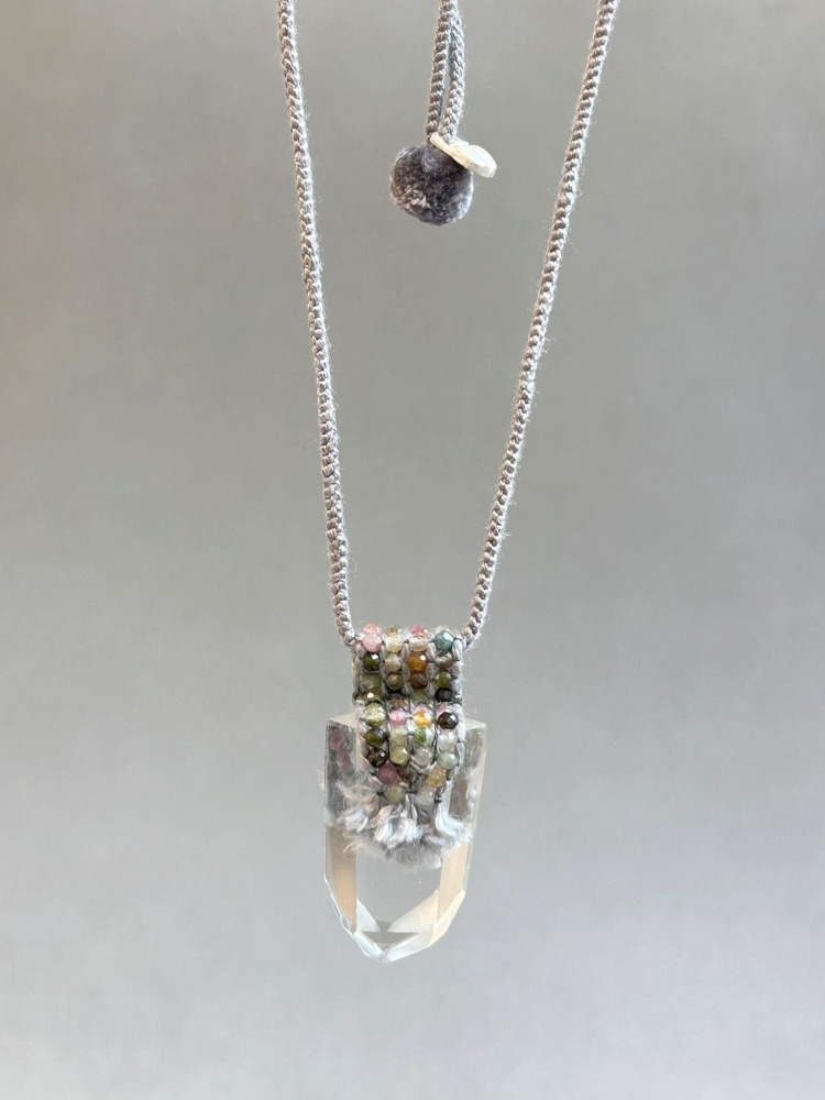 Necklace with a white quartz, with a waist loom and tourmalines; the cord is woven in long gray silk.