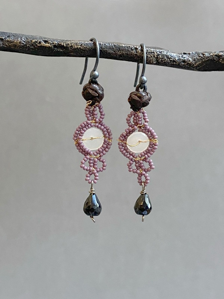 Long earrings with a leather ball, purple Murano glass, in the center with a moonstone hoop and ends with an obsidian drop.
