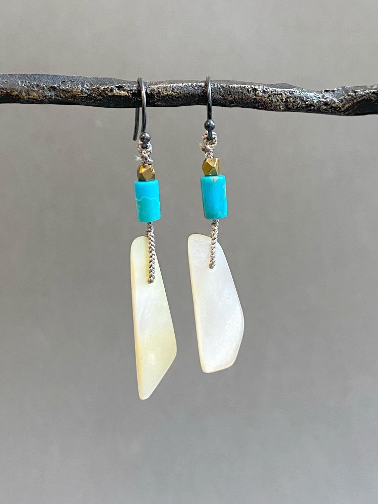 Earrings woven in silk, with mother of pearl, turquoise, and brass chips.