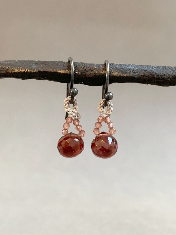 Small earrings woven in silk, with faceted beads and a drop in the center.