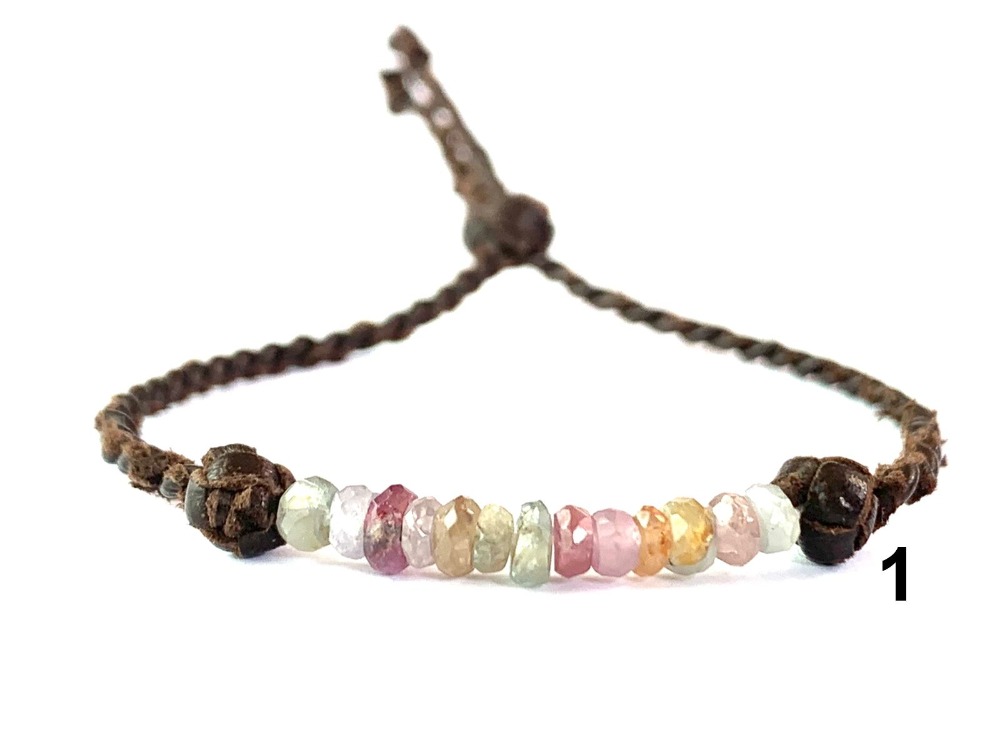BRACELET WITH A ROW OF PRECIOUS AND SEMI-PRECIOUS STONES WITH A BRAIDED LEATHER BALL ON EACH SIDE AND THE OTHER PART WITH BRAIDED LEATHER WITH A LEATHER ADJUSTER.