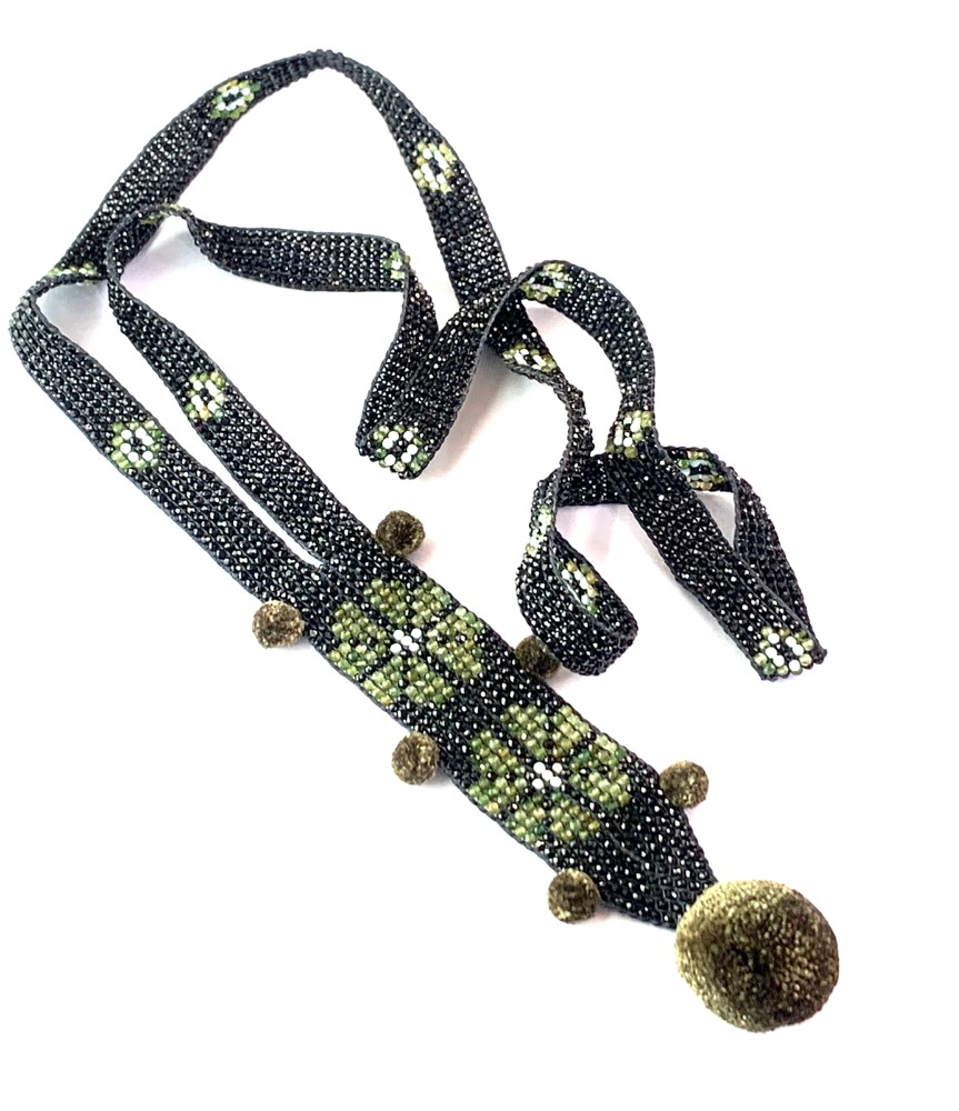 This magnificent collar is made of 2mm stones, with faceted spinel with a unique shine, forming flowers with green garnets, the perfect combination not forgetting the military green silk pom poms.