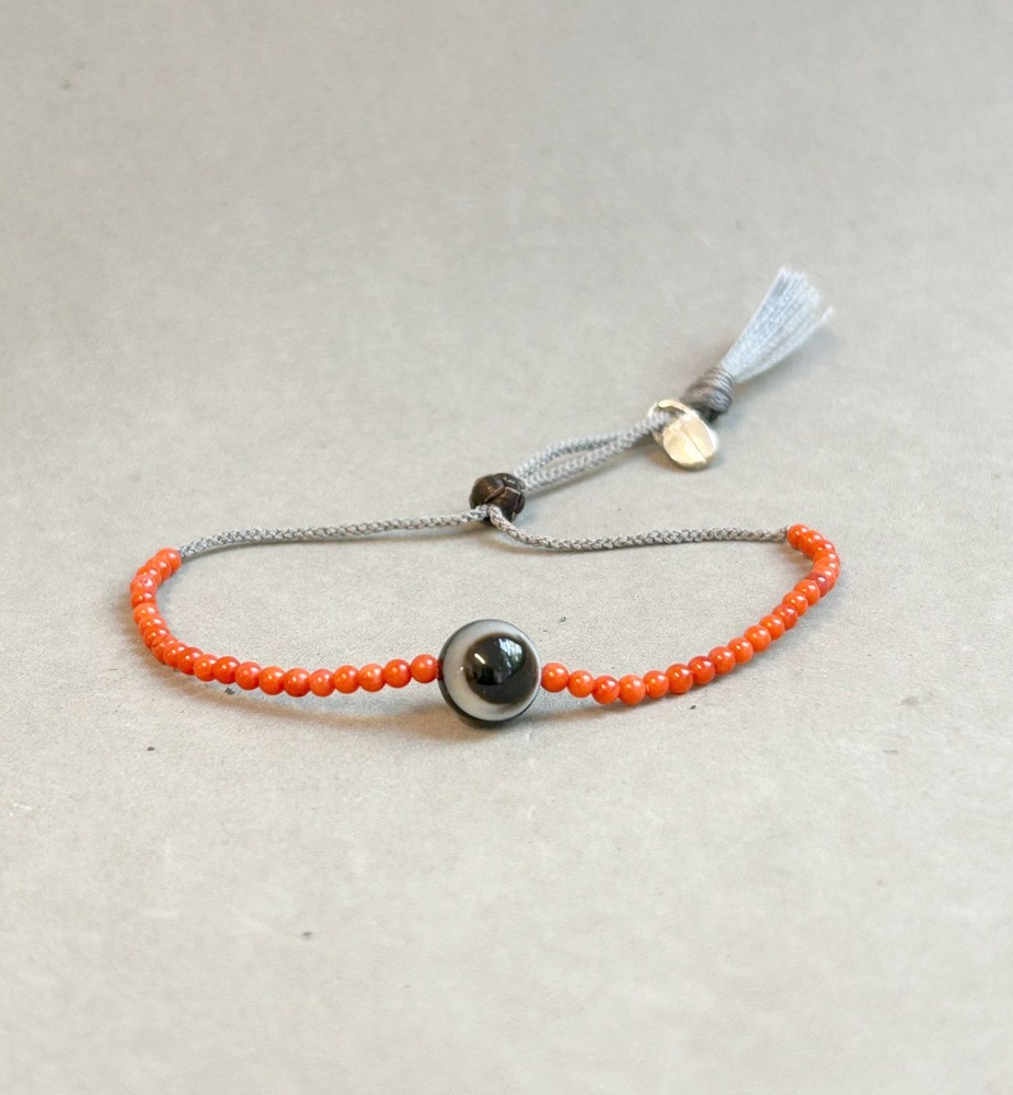 Red coral bracelet with an agate forming a round eye, it has a leather adjuster to fasten.