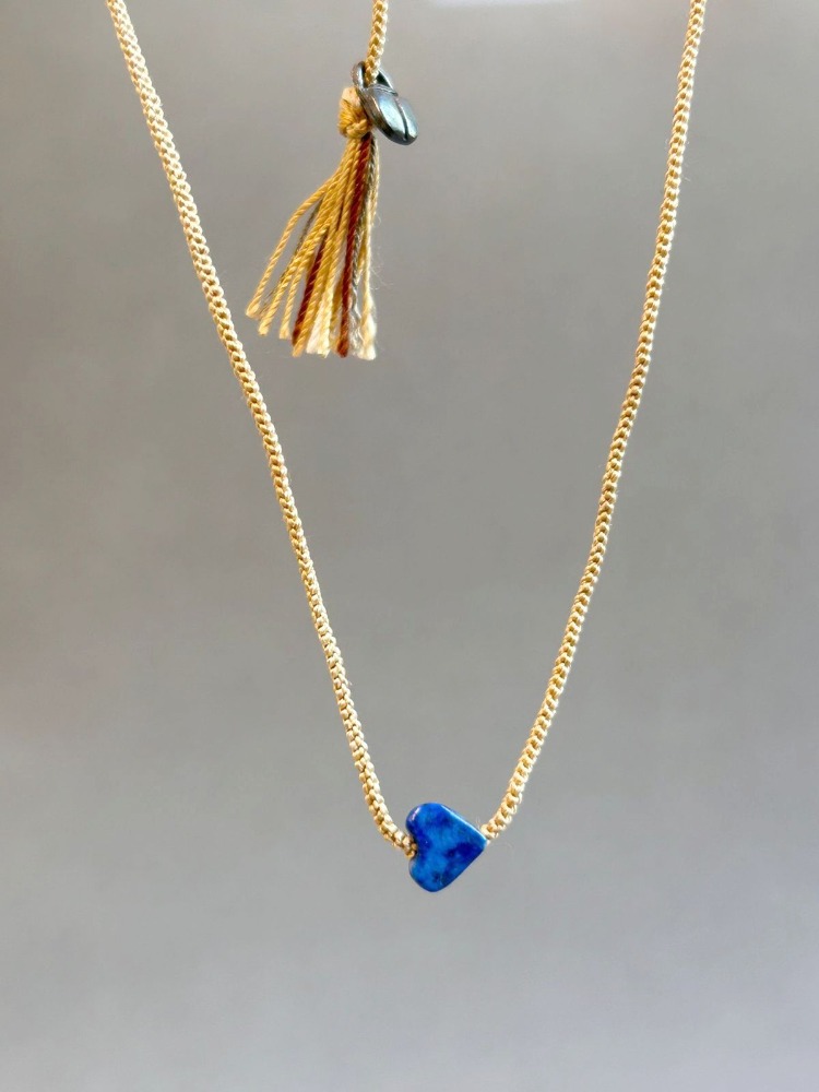 Necklace woven in golden silk, with a lapis lazuli heart in the center, it fastens with a parakeet and a 925 silver hoop.