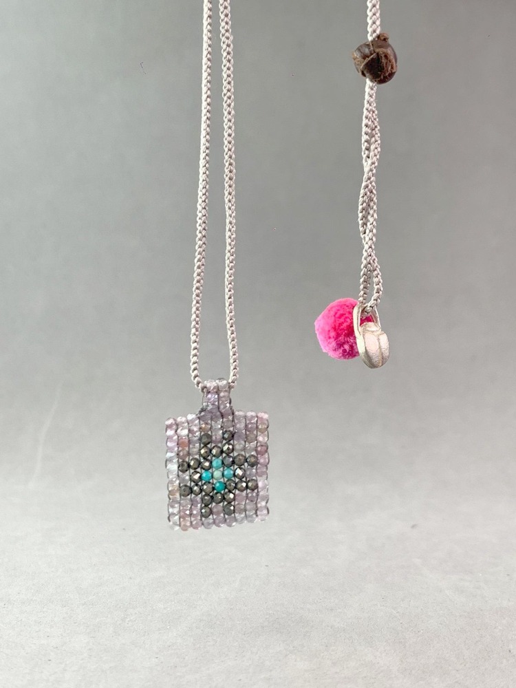 Hand-braided silk necklace with a gemstone square forming a star and finishing with a silk pom-pom SKU: 2999