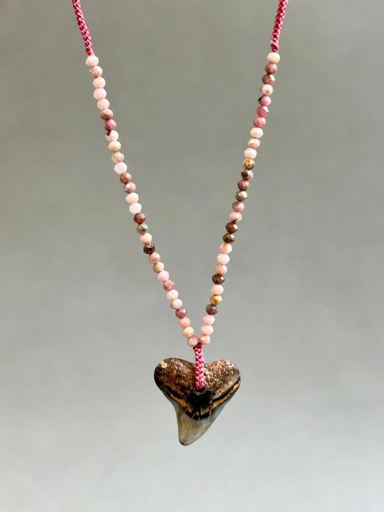 Braided silk necklace with semiprecious stones and a fossilized shark tooth. It ends with a silk pom pom. SKU: 2326
