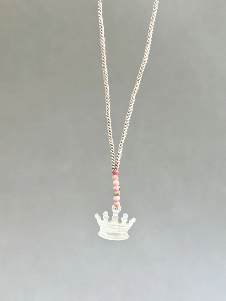 Gray braided silk necklace with iolite or rhodochrosite and a mother of pearl crown charm. It has a leather adjuster and ends in a pom pom.
