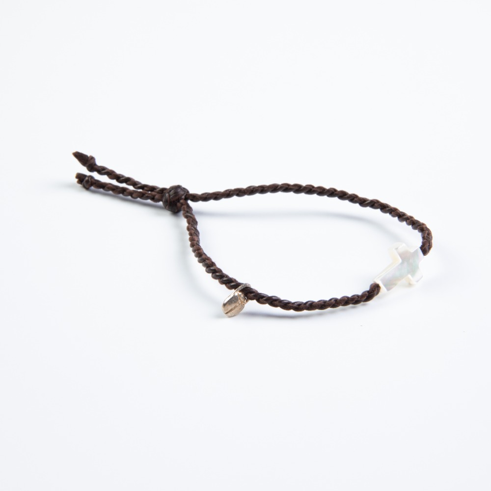 Braided leather bracelet with a mother-of-pearl cross in the center and a leather adjuster. SKU: 2565