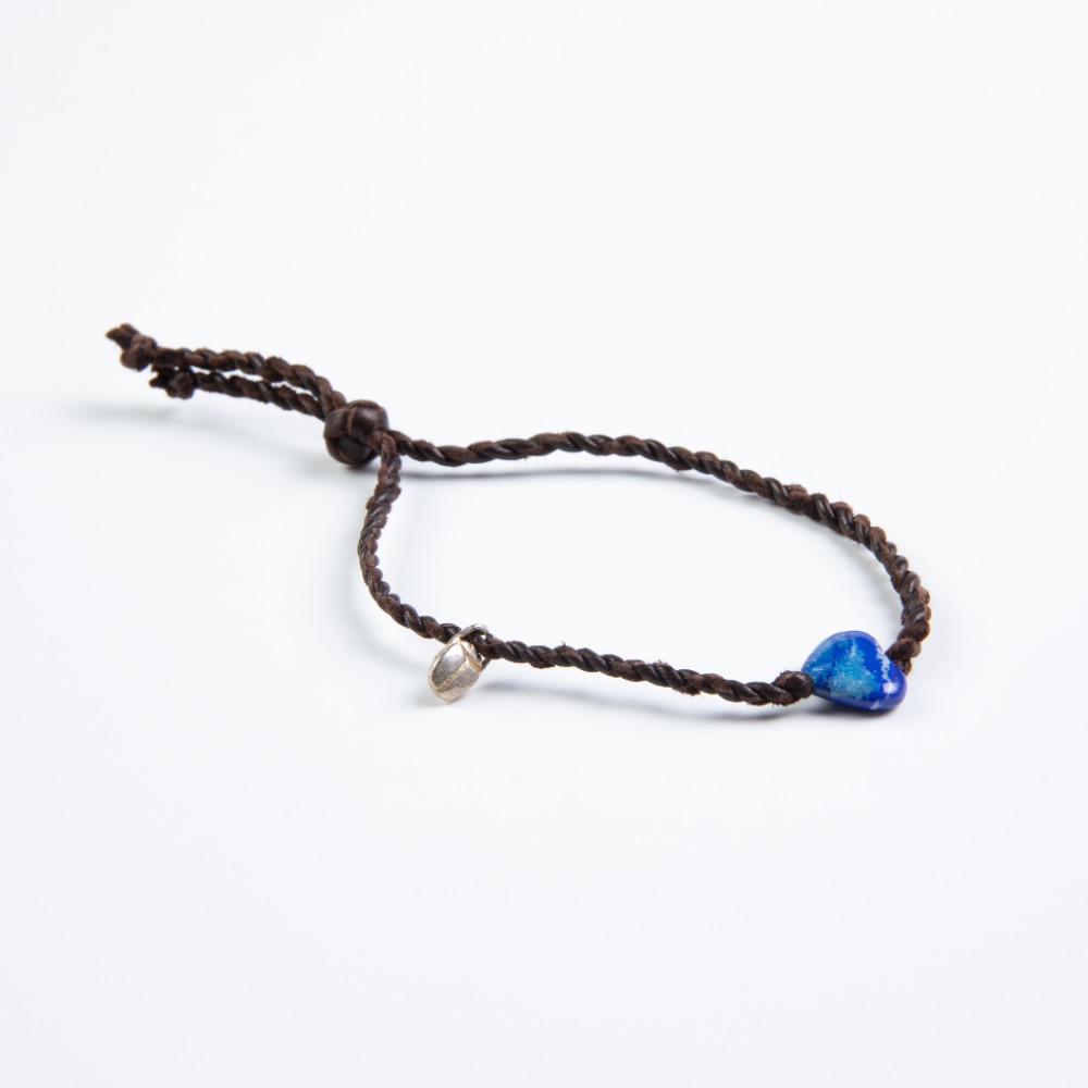 Braided leather bracelet with a lapis lazuli heart in the center and a leather adjuster.