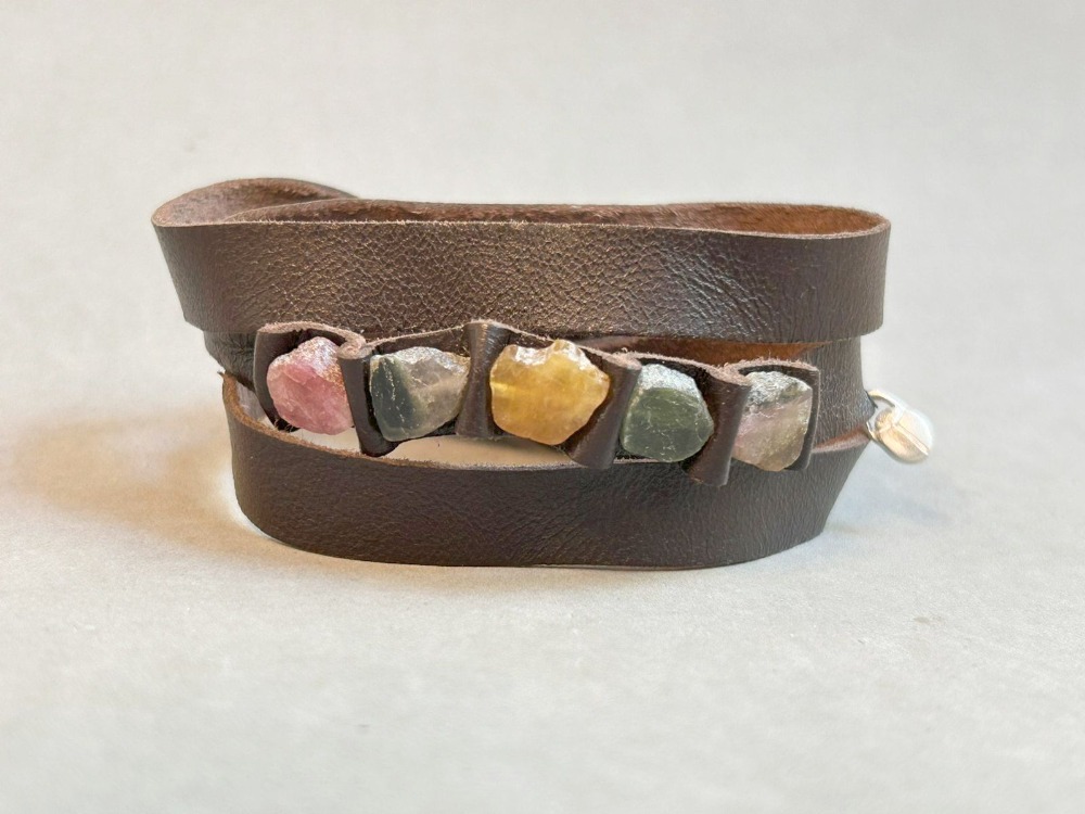 Leather bracelet with tourmalines at the center, it wraps around the hand and is tied in a knot to close. The beautiful thing about this piece is that you can also wear it as a choker; it‘s spectacular.